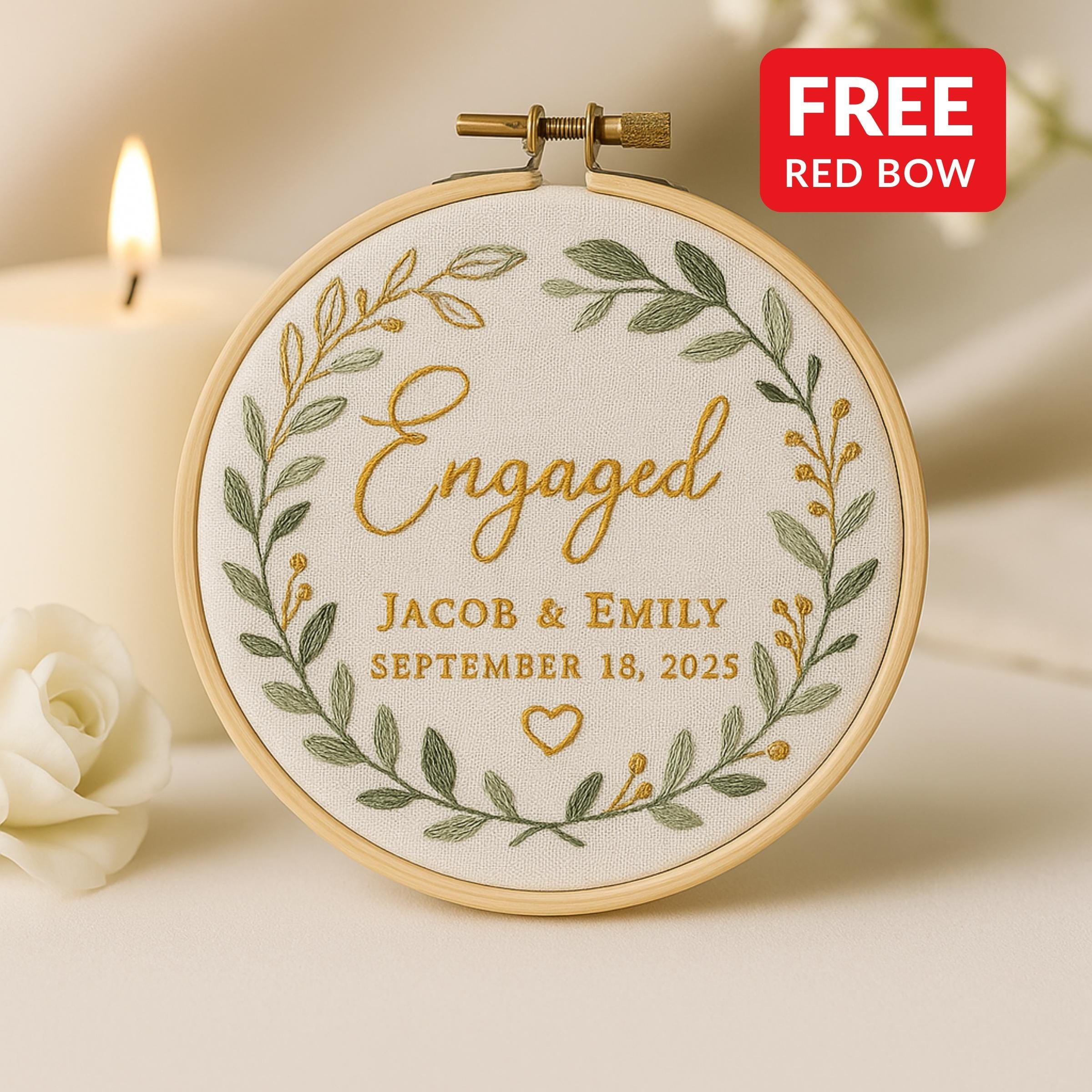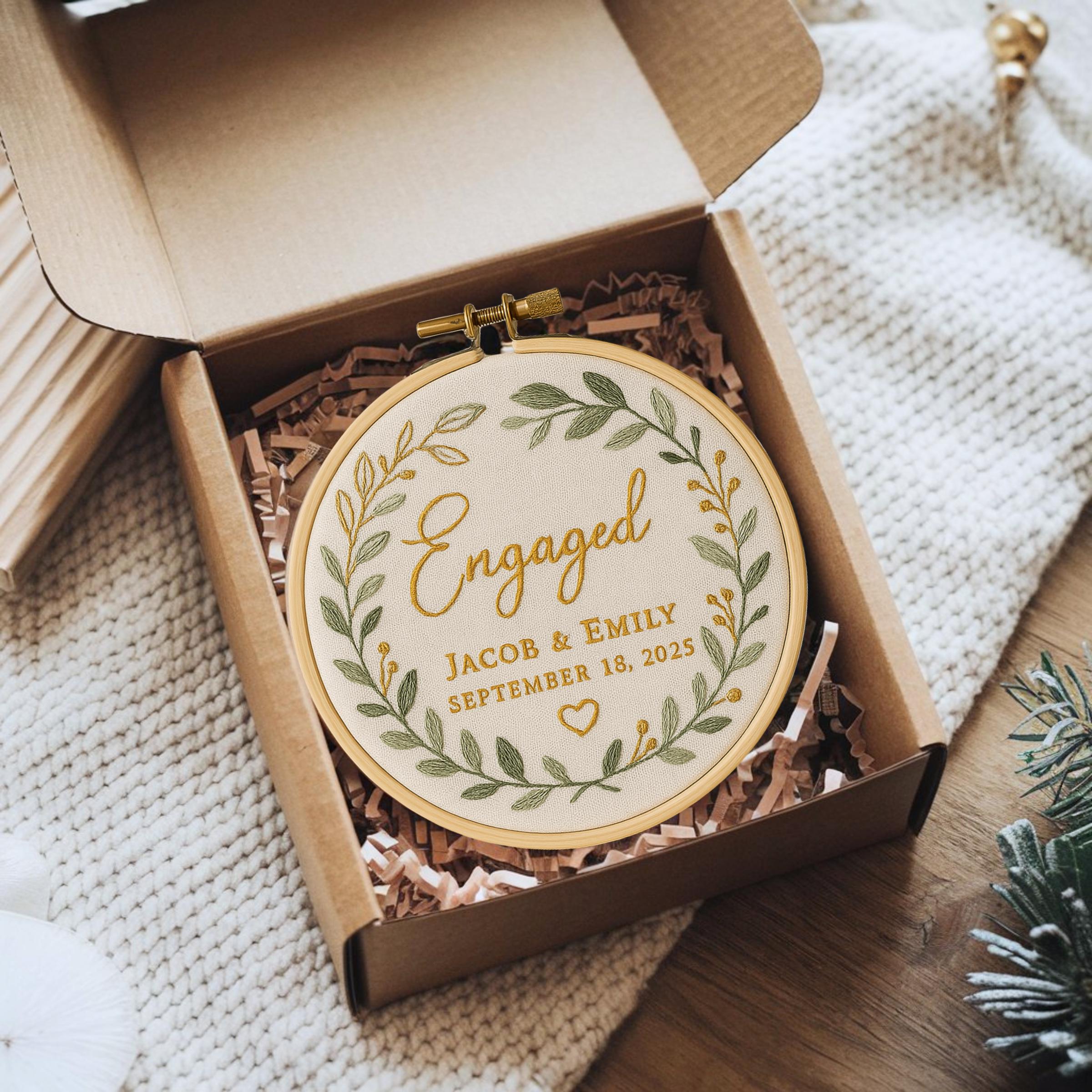 Celebrate your engagement with a beautifully embroidered keepsake ornament made just for you. This personalized hoop features your names and engagement date, surrounded by a delicate botanical wreath stitched with care. Elegant, timeless and meaningful, it is the perfect way to honor your love story or share your exciting news with family and friends.