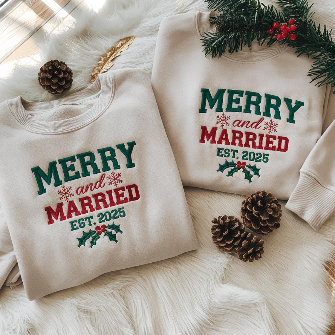 Celebrate the magic of the season with our Merry and Married embroidered sweatshirts, a cozy and meaningful matching set made especially for newlyweds. Each sweater is beautifully stitched with festive holiday colors and your special established date, creating a timeless keepsake you will treasure for every Christmas to come.
