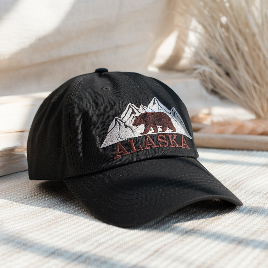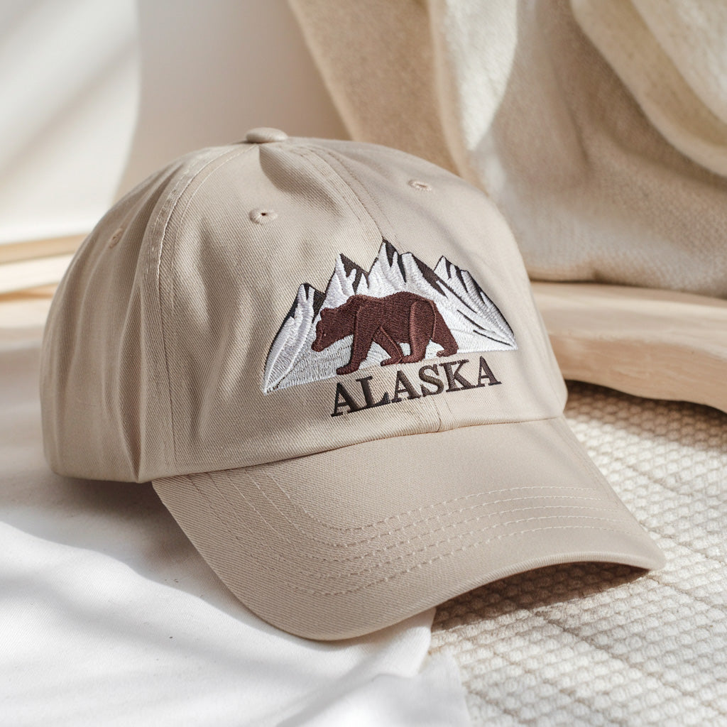 Alaska Mountain Bear Embroidered Cap – Outdoor Adventure Hat, Adjustable Cotton Twill